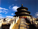 天坛公园位于北京市南部,东城区永定门内大街东侧,占地约270万平方米。在整个北京城里,北有地坛祭地,南有天坛祭天,东有日坛祭太阳,西有月坛祭月亮,其中天坛最为光彩夺目、气宇非凡。 天坛始建于明永乐十八年(1420年),清乾隆、光绪时曾重修改建。为明、清两代帝王祭祀皇天、祈五谷丰登之场所。天坛是圜丘、祈谷两坛的总称,有坛墙两重,形成内外坛,坛墙南方北圆,象征天圆地方。主要建筑在内坛,圜丘坛在南、祈谷坛在北,二坛同在一条南北轴线上,中间有墙相隔。圜丘坛内主要建筑有圜丘坛、皇穹宇等等,祈谷坛内主要建筑有祈年殿、皇乾殿、祈年门等。著名的祈年殿在最北方,这是天坛内最宏伟、最华丽的建筑,也是想象中离天最近的地方。祈年殿的上下三层屋顶,均用深兰色琉璃瓦铺盖,象征天色。坛面除中心的太极石是圆形外,外围各圈均为扇面形,数目也是阳数,象征九重天,天帝的牌位就安放在太极石上,象征着天帝高居九重天之上。圜丘坛的附属建筑有皇穹宇及回音壁。如果说天安门城楼已成为中国的象征,那么天坛祈年殿就是北京这座不朽名城的象征。