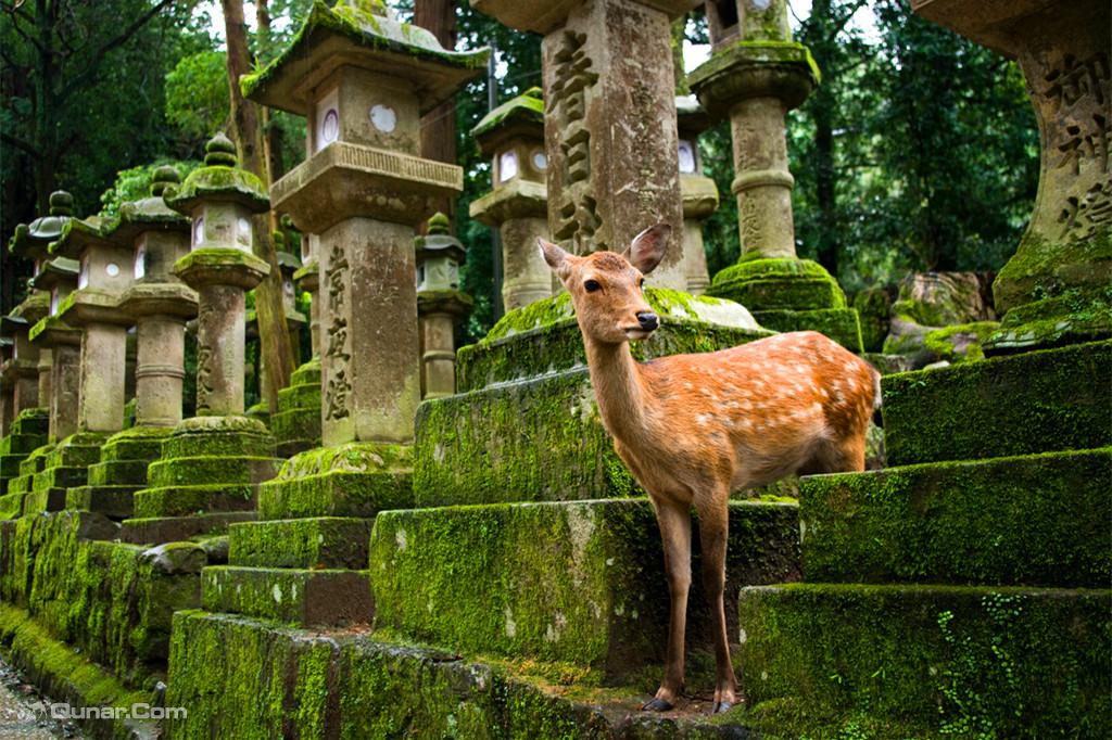 奈良公园位于奈良市街的东边,东西长4公里、南北宽2公里,面积广阔,若草山、东大寺、春日大社、国立博物馆等奈良的名胜古迹大多在这里。在明治21年(1888年)成为县立公园,是日本现代公园的先驱之一。大正11年(1922年)被指定为日本的国家名胜。 成群嬉戏于公园里的鹿,因与春日大社流传的白鹿传说有关而受到保护,且被指定为国家的自然保护动物。享受这美丽的大自然最好是在碧绿的若草山和鹿毛色美的4、5月,或是满山红叶的秋天等出游行乐、毕业旅行的季节。但是,在淡季时您可悠闲自在的在此散步。一年四季无论何时,这里都有吸引人的景观。 其中有1200头鹿生活在这里,这些鹿大多温顺而讨人喜爱。