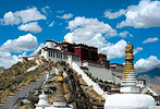 布达拉宫在西藏拉萨西北的玛布日山上,是著名的宫堡式建筑群,藏族古建筑艺术的精华。 布达拉宫始建于公元7世纪,是藏王松赞干布为远嫁西藏的唐朝文成公主而建。在拉萨海拔3,700多米的红山上建造了999间房屋的宫宇--布达拉宫。宫堡依山而建,现占地41万平方米,建筑面积13万平方米,宫体主楼13层,高115米,全部为石木结构,5座宫顶覆盖镏金铜瓦,金光灿烂,气势雄伟,是藏族古建筑艺术的精华。被誉为高原圣殿。 布达拉宫内部绘有大量的壁画,构成一座巨大的绘画艺术长廊,先后参加壁画绘制的近有二百人,先后用去十余年时间。壁画的题材有西藏佛教发展的历史,无世达喇嘛生平,文成公主进藏的过程,西藏古代建筑形象和大量佛像,金刚是一部珍贵的历史画篆。布达拉宫中各座殿堂中保存有大量的珍贵文物和佛教艺术品。无世达 的灵塔,座落在灵塔殿中。塔高14.85米,是宫中最高的灵塔,塔身用黄金包裹,并嵌满各种珠宝玉石,建造中耗费黄金11万两。其它几座灵塔虽不如达赖喇嘛灵塔高大,其外表的装饰同样使用大量黄金和珠宝,可谓价值连城。 布达拉宫整体为石木结构宫殿外墙厚达2~5米,基础直接埋入岩层。墙身全部用花岗岩砌筑,高达数十米,每隔一段距离,中间灌注铁汁,进行加固,提高了墙体抗震能力,坚固稳定。 屋顶和窗檐用木制结构,飞檐外挑,屋角翘起,铜瓦鎏金,用鎏金经幢,宝瓶,摩蝎鱼和金翅乌做,脊饰。闪亮的屋顶采用歇山式和攒尖式,具有汉代建筑风格。屋檐下的墙面装饰有鎏金铜饰,形象都是佛教法器式八宝,有浓重的藏传佛教色彩。柱身和粱仿上布满了鲜艳的彩画和华丽的雕饰。内不廊道交错,殿堂杂陈,空间曲折莫测,置身其中,步入神秘世界。