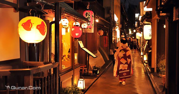 祗园是京都的艺妓区。白天,你可以漫步于花见古寺边,7世纪的餐馆和茶馆。但这个地区在傍晚才真正生动起来,灯笼微明,灯光在纸窗后柔和地闪动,你可以见到实习期间的艺妓正匆忙地工作。 作为八坂神社的门前街道发展起来的祗园是日本规格最高的繁华街,讲到京都就会联想到祗园,可以说是代表性的地区。在道路的两旁是纵横方向能通风的用细细的方材建成的格子窗,大街的格调与舞妓的风采十分相称,街上排列着销售发簪、香和日式服装装饰物品等京都特有的商店,而在日式建筑中也有许多可品尝中式菜和意式菜等的餐馆,这也是祗园的另一个魅力。既继承了传统,又不断接受新事物的祗园受到人们的喜爱。 另外,祗园每年夏天举办的祗园节也广为人知。在祗园节时,人们在豪华装饰的彩车上用笛子、锣鼓和大鼓演奏着祗园音乐,从街上通过,是个热闹异常的节日,每年有100多万人前去观看。