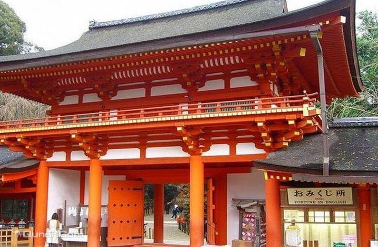 春日大社南门春日大社(かすがたいしゃ)是一座位于奈良县奈良市奈良公园内的神社。旧称春日神社。建于和铜二年(710年)。社内供奉的神明包括武瓮槌命、经津主命、天儿屋根命和比卖神。神社例祭日为3月13日(春日祭)。建设者为藤原不比等。作为古奈良的历史遗迹的一部分而被登入世界文化遗产之列。为二十二社之一。春日大社这是一处被原始森林环抱的古建筑,现已被列入世界文化遗产名录。 公元710年,为当时的掌权者藤原家族的守护神而建造起来的神社,神社内也因藤而出名。另外,在罗列在参道两旁的近2000盏“石灯笼”上点燃火后变成的“万灯笼”能显现出幻想般的世界。还有,在“春日大社神苑”里种植着约300个品种的植物,这些植物均在古代有名的歌集《万叶集》中有记载。 神苑、宝物殿 9:00~16:00 / 单只神苑在星期一休息(若星期一是国定假日时,则休息延续至第二天,1月和4~6月、10~11月 免休息)免费(神苑 525日元 宝物420日元) 从JR-近铁奈良车站乘70、88、97、98、133路公共汽车,到Kasuga Taisya Honden下车后即到 主要的对外公开活动:春日大社中元万灯笼...8月14日~15日,...12月15日~18日