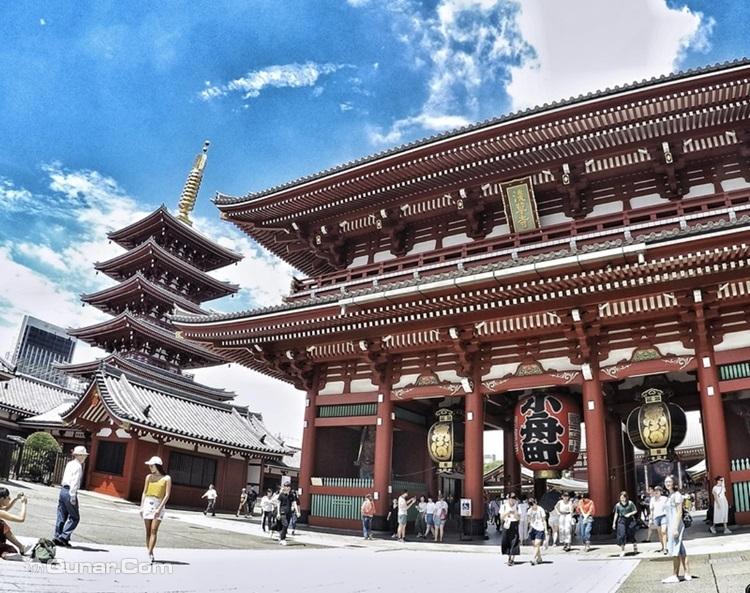 浅草寺位于东京台东区,是日本现存的具有“江户风格”的民众游乐之地。相传,在推古天皇三十六年(公元628年),有两个渔民在宫户川捕鱼,捞起了一座高5.5厘米的金观音像,附近人家就集资修建了一座庙宇供奉这尊佛像,这就是浅草寺。其后该寺屡遭豳火之灾,数次被毁。到江户初期,德川家康重建浅草寺,使它变成一座大寺院,并成为附近江户市民的游乐之地。寺院的大门叫“雷门”,门内有长约140米的铺石参拜神道通向供着观音像的正殿。寺西南角有一座五重塔,仅次于京都东寺的五重塔,为日本第二高塔。寺东北有浅草神社,造型典雅,雕刻优美。
