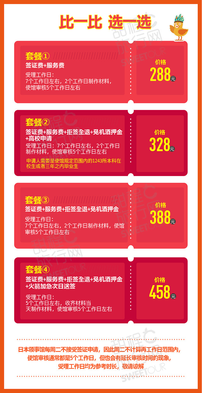 2. 不保签,部分套餐拒签全损。 3. 日本邀请函发出后,如撤签需收取损失100元/人。