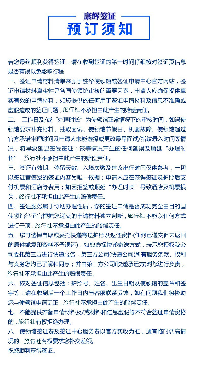 7、预订机票酒店时我们真诚的希望您拿到签证后再预订以免造成不必要的损失。