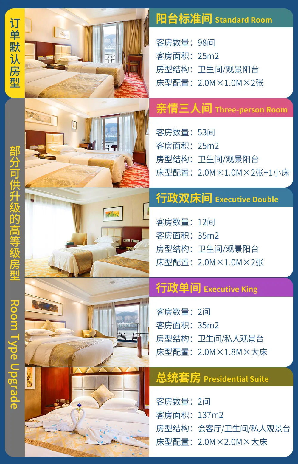 备注:如遇强降雨季节的汛期或旱期,游船不能直接开抵重庆码头,由船方安排专线大巴将贵宾转运至涪陵或丰都港上船(涪陵码头上船2小时左右车程,丰都码头上船3小时左右车程)转运车费由船方承担!
