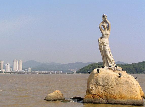 珠海市风景秀丽的香炉湾畔,矗立着一尊巨型石雕——珠海渔女。她项戴项珠,身掮渔网,裤脚轻挽,双手高擎着一颗璀璨夺目的珍珠,带着喜悦而又含羞的神情,向世界召示着光明,向人类奉献上珍宝。 关于珠海渔女的 民间传说是这样的:相传远古时代有位仙女被香炉湾美丽的风光迷住了,扮成渔女下凡到人间,以其心灵手巧,美丽善良而深受渔民喜爱,并与憨厚老实的渔民海鹏私定终身。但海鹏听信谗言,执意要仙女摘下维系性命的手镯作定情信物,仙女为表明心志,毅然拉下手镯,旋即昏死在情人怀中,海鹏悔恨已晚,饮声泣血,哀天恸地。九洲长老为这深情厚爱所感动,引导海鹏采来一枝还魂草,用鲜血浇灌成长,救活了仙女。从此仙女成了真正的渔女。成亲那天,渔女把她挖到的一颗举世无双的宝珠,献给了德高望重的九洲长老。 这座由中国著名雕塑家潘鹤根据南海渔民的美丽传说而设计制作的大型石雕,身高 8.7米,重量达10吨,用花岗岩分七十件组合而成。如今,这座石雕已成为珠海市的象征,凡是来珠海旅游的人,都要争先一睹她的芳容。一条美丽整洁的环海大道从她身旁穿过,这就更方便游客了。