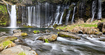 白丝瀑布位于轻井泽的北部,落差高三公尺,幅宽七十公尺。浅间山贮存的地下水沿着蜿蜒曲折的岩石陡壁,如数百条白丝飞流直下,身临其中感到清凉湿润、美不胜收。未汇集成瀑布前的溪流也清净幽美。